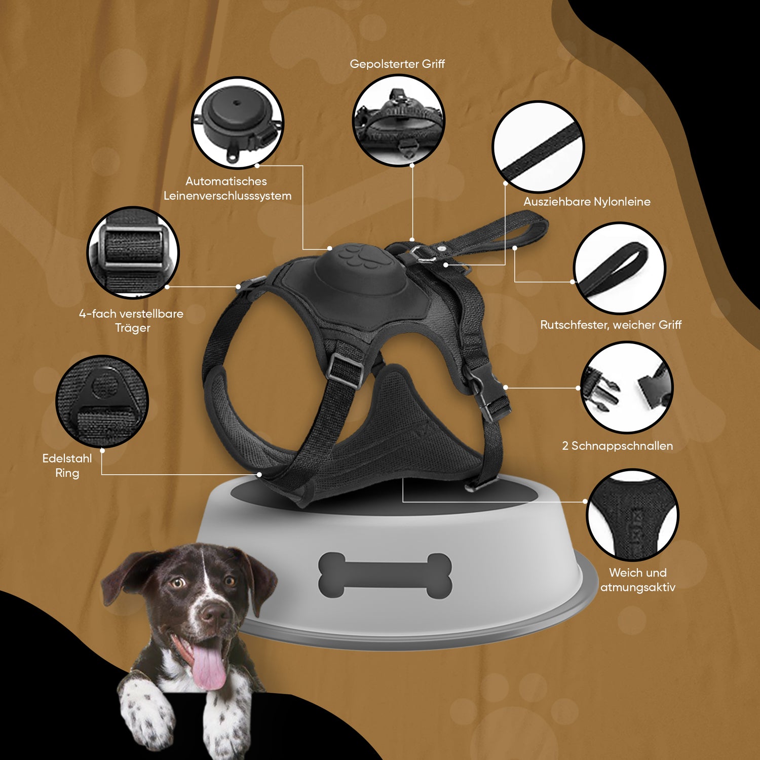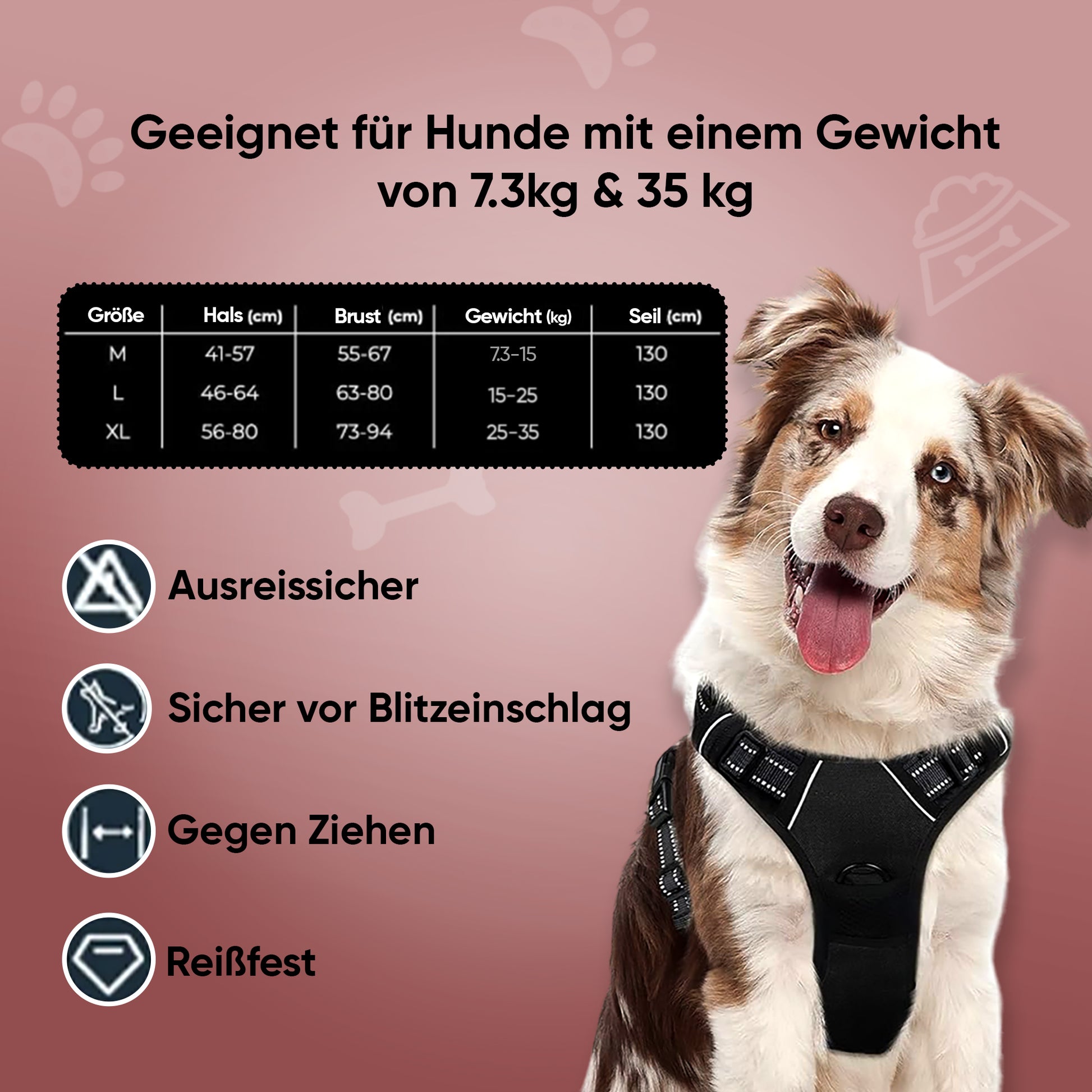 Durch das integrierte Design des Hundegeschirrs mit Leine haben Hundebesitzer eine bessere Kontrolle über ihre Hunde. Das Geschirr verteilt den Druck gleichmäßig über den Körper des Hundes, was besonders nützlich ist, um das Ziehen an der Leine zu reduzieren und ein angenehmeres Spaziererlebnis für sowohl den Hund als auch